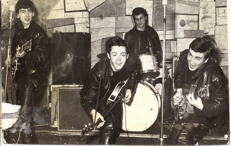 Los beatles en el pub cavern club en Liverpool, con chamarras de cuero , pelo engominado para poder hacerse el túpe al estilo de los artistas americanos que admiraban, entre ellos a Elvis Presley